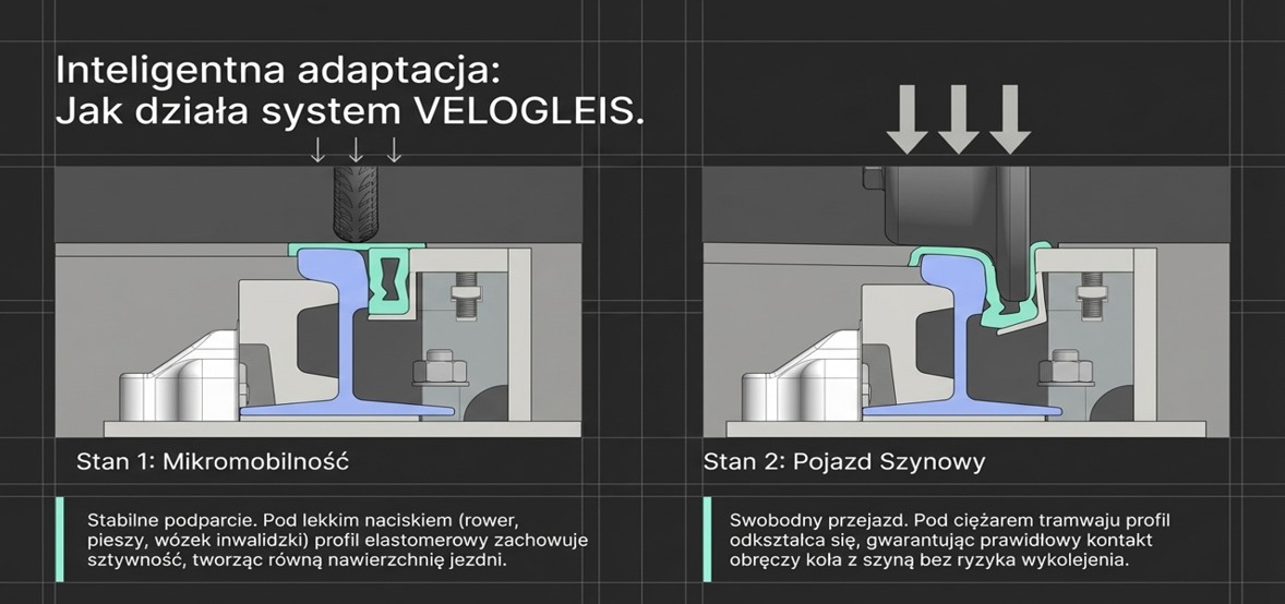 VeloGleis to profil elastomerowy, który wypełnia przestrzeń przyszynową i pozwala na bezpieczne poruszanie się rowerzystów i pieszych po torowiskach, przy jednoczesnym zachowaniu funkcji torowiska. Pozwala rozwiązać paradoks urbanistyczny, w którym wizją miast jest promowanie ekologicznego transportu współdzielonego i mikromobilności, a w rzeczywistości tradycyjne szyny wymuszają niebezpieczne kompromisy i wykluczają rowerzystów ze strefy torowiska.